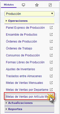 a. Al haber ingresado a eFactory debemos desplegar la lista y seleccionar el módulo Producción, también desplegamos el componente Operaciones y activamos el sub. componente Metas de Ventas por Departamento Mensualmente.