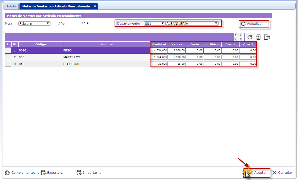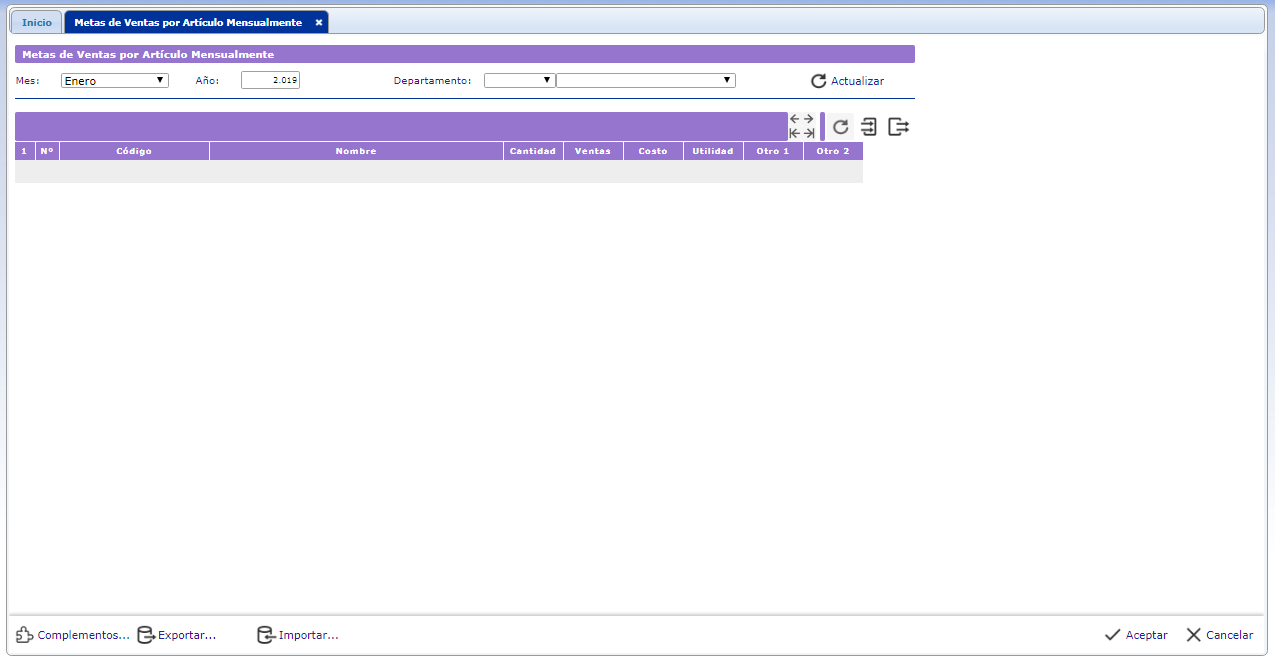 En este formulario puedes cargar las metas de ventas propuestas por Artículo y por mes, dependiendo del departamento, en este caso debes seleccionar un año, un mes y un departamento en específico, presionar el botón 'Actualizar', y enseguida aparecerá la lista de todos los pertenecientes al departamento seleccionado y los campos para cargar los siguientes datos: cantidad mensual, ventas, costo, utilidad, otro 1, otro 2. También puedes importar o exportar las metas de un mes y año específico en formato XML.