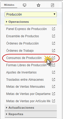 b. En el módulo Producción, desplegamos el componente Operaciones y activamos el sub. componente Consumos de Producción.