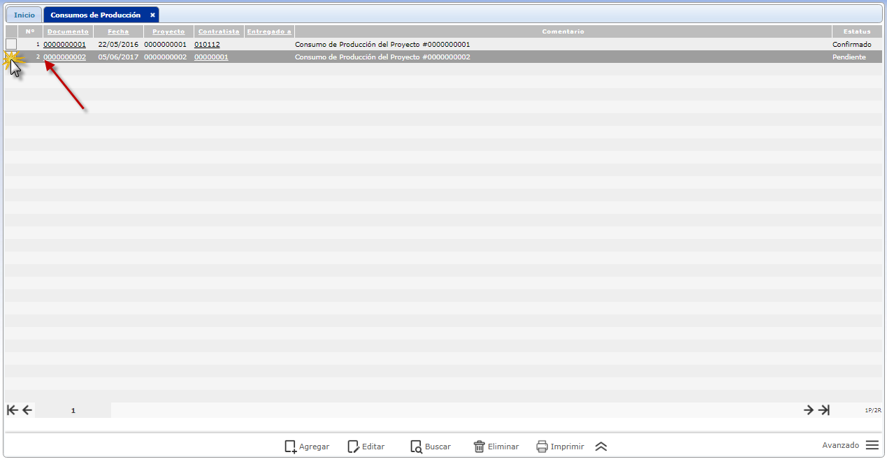 En esta opción puedes cargar todos los consumos necesarios para cumplir con el proceso de producción, la pantalla principal muestra una lista con todos los consumos que han sido cargados, además puedes visualizar en detalle el consumo que desees al dar clic en el campo 'Documento', de igual forma si das clic en el campo 'Contratista' algún renglón en específico podrás apreciar la información de la contratista o proveedor asociado a la producción.