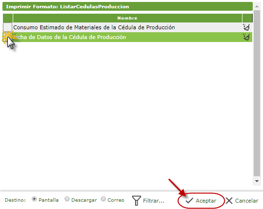 b. Después se muestra la ventana de Imprimir Formato: ListarCedulasProduccion donde seleccionaremos el