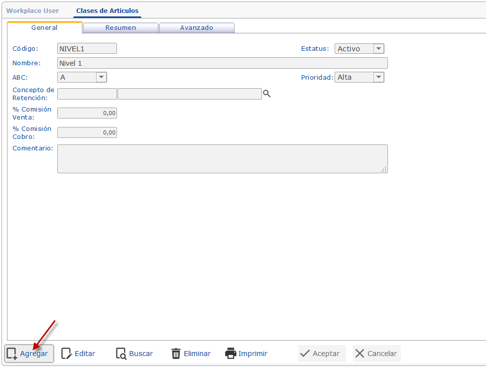 a. Se muestra la ventana Clases de Artículos, allí presionamos el botón