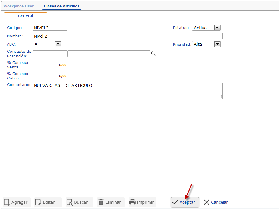 Comentario: Escribimos cualquier observación respecto a la Clase de Artículo creada.