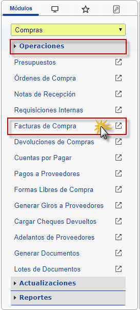 b. En el módulo Compras, desplegamos el componente Operaciones y activamos el sub componente Facturas de Compras.