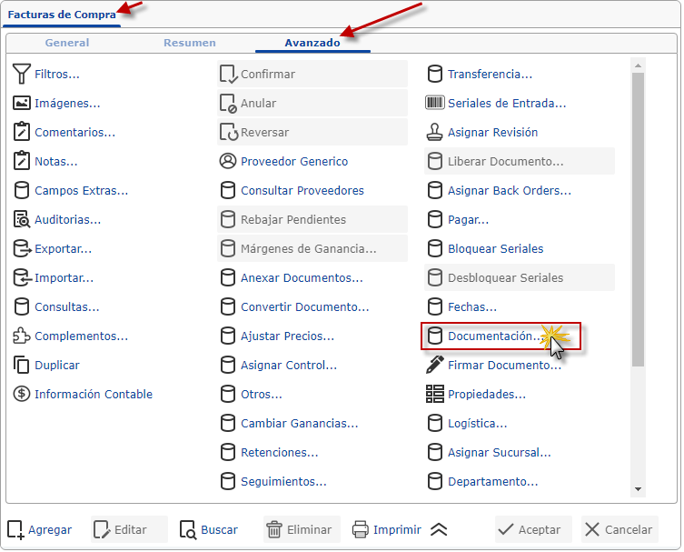 a. Al seleccionar Facturas de Compras, presionamos la pestaña de resumen y procedemos a seleccionar el documento que deseemos escanear.