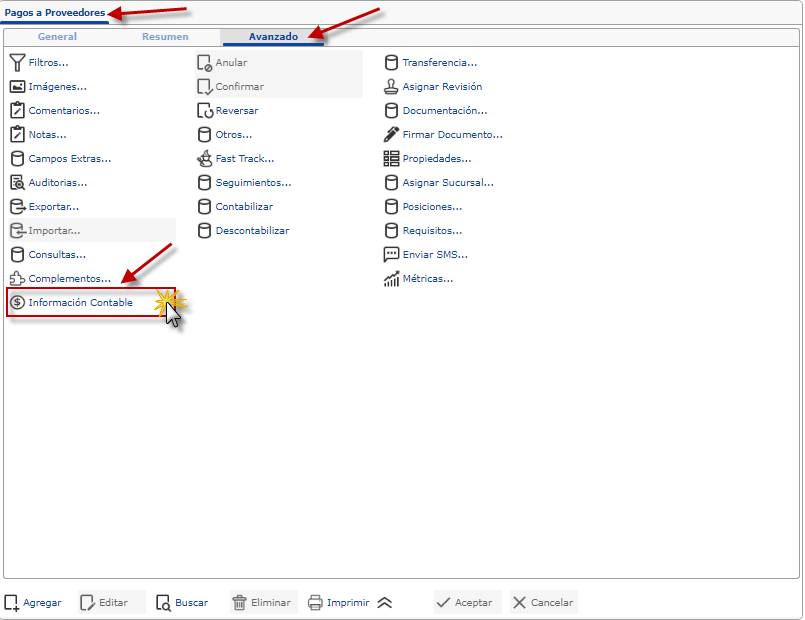 c. Para incluir otra vez el Pago en la Contabilidad, vamos nuevamente a la ventana Pagos a Proveedores, ficha Avanzado, presionamos el ícono Confirmar y luego Contabilizar.