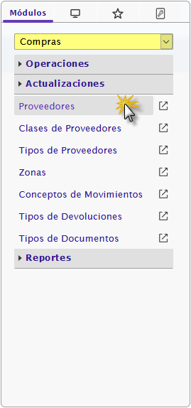 a. Al ingresar en el sistema debemos seleccionar el módulo Compras y al desplegar la sección de Actualizaciones seleccionaremos la opción de Proveedores.