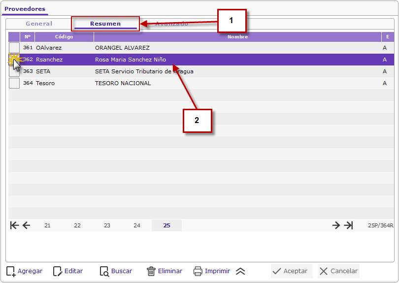 a. Luego de haber seleccionado la opción de Proveedores se muestra la pantalla donde presionaremos la ficha Resumen para buscar