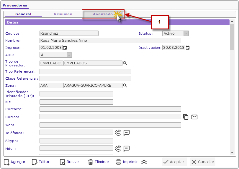 a. Al seleccionar el Proveedor procedemos a hacer clic en la pestaña Avanzado.