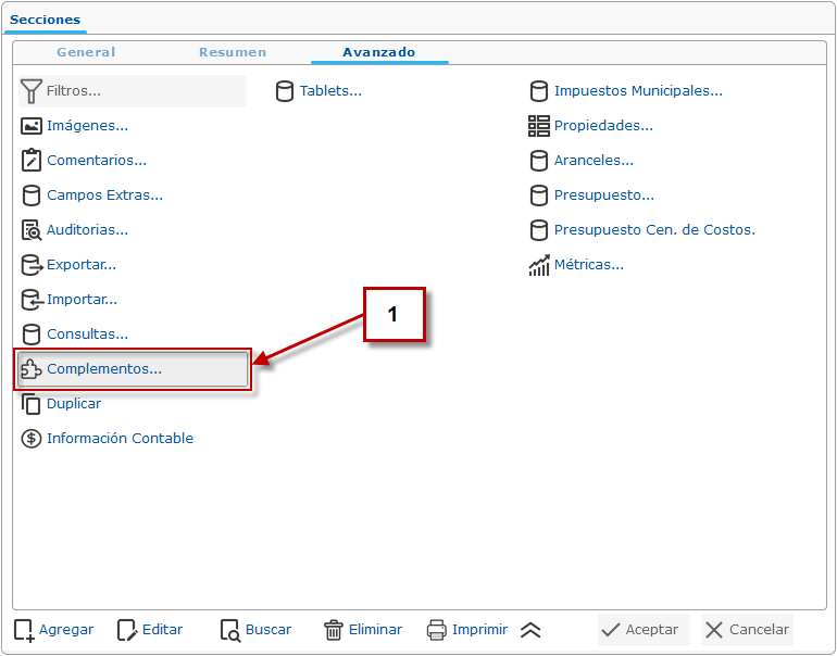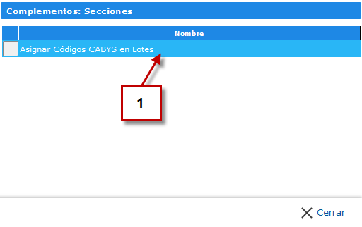 c. Al abrir la pantalla de Complementos: Secciones, debemos seleccionar la opción Asignar Códigos CABYS en Lotes.