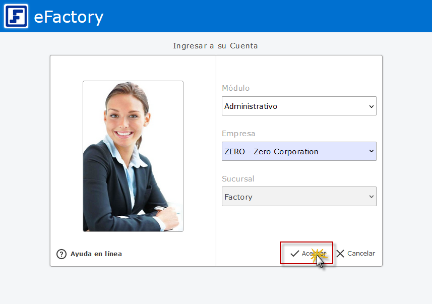 Primero debemos ingresar al sistema administrativo de eFactory colocando nuestro usuario y contraseña en la pantalla inicial de eFactory, luego presionaremos el botón de