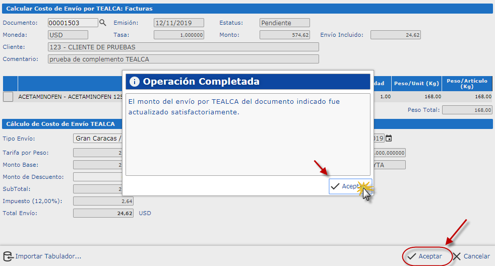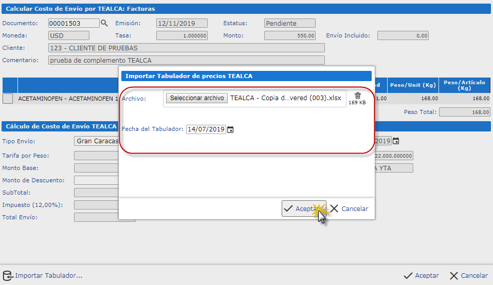 También se mostrarán los renglones del documento con sus pesos asociados (Excepto el artículo de envío: "TEALCA YTA"), más abajo, en la sección de Cálculo de Costo de Envío TEALCA