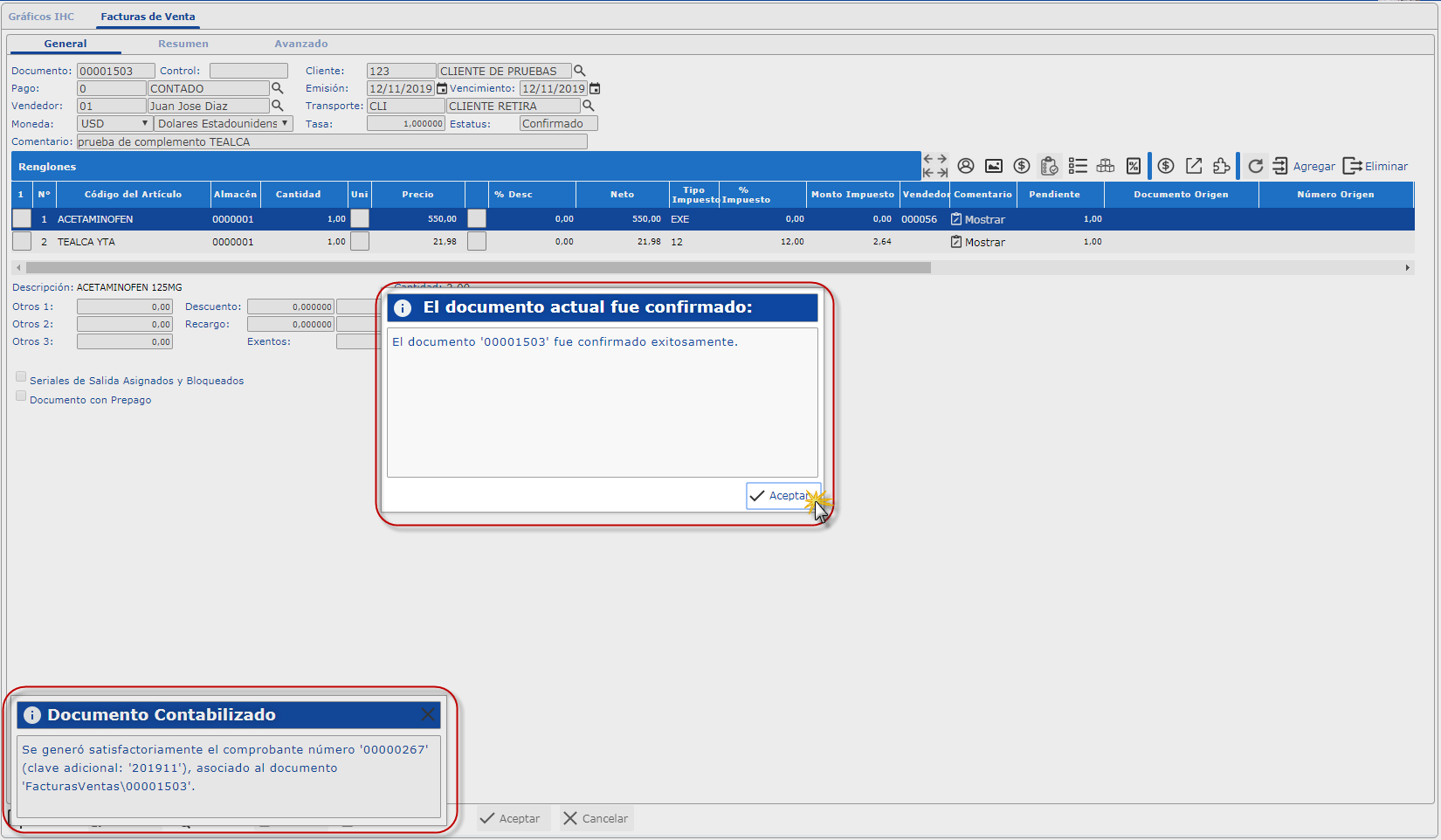 nos dice que el documento actual fue confirmado exitosamente y contabilizado.