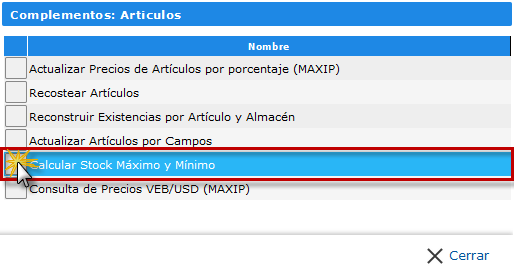 se abrirá la pantalla Complementos: Artículos, en la que debemos hacer clic en la opción Calcular Stock Máximo y Mínimo.