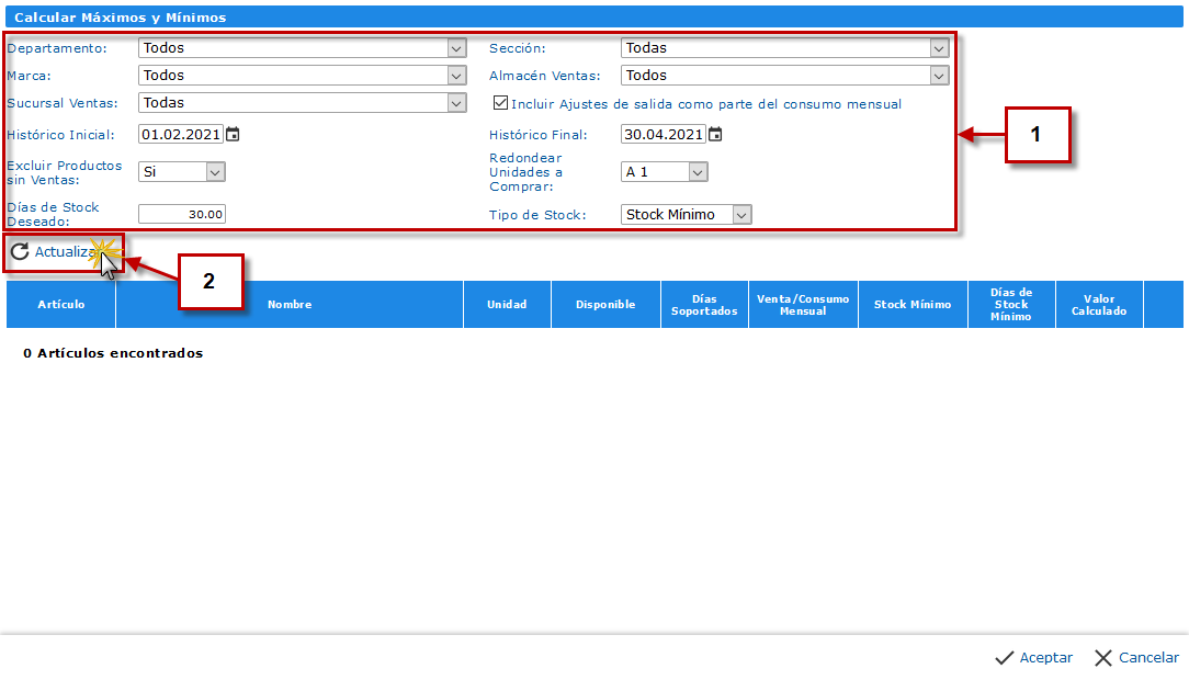 c. Al hacer clic en Calcular Stock Máximo y Mínimo se abrirá la pantalla Calcular Máximos y Mínimos, en la que debemos configurar los filtros y parámetros para calcular los máximos o mínimos de los artículos.