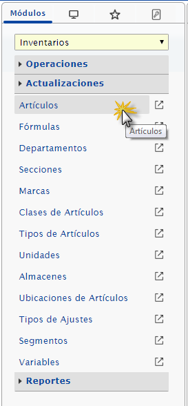 b. Luego de haber ingresado a eFactory nos ubicamos en el menú, donde desplegamos la lista y seleccionaremos el módulo Inventarios, desplegamos el componente Actualizaciones y activamos el maestro Artículos.