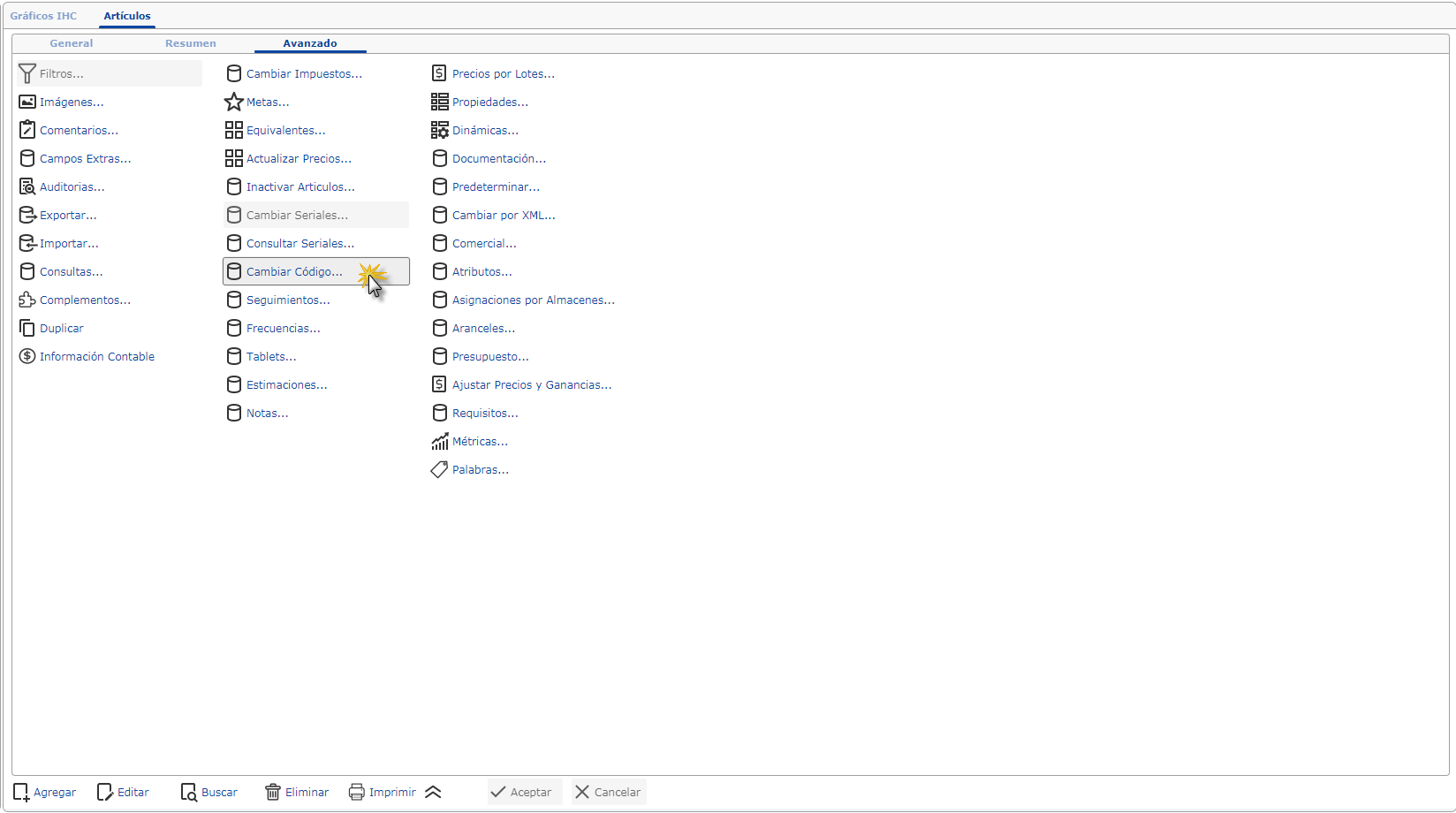 a. Al haber seleccionado el maestro Artículos nos ubicamos en la ficha Avanzados donde seleccionaremos