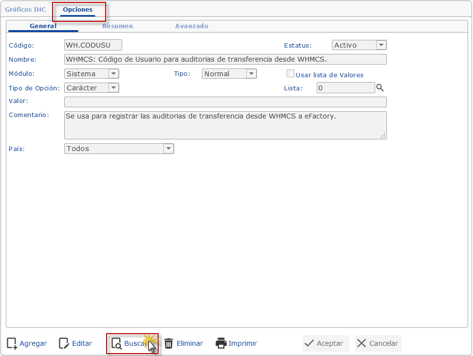 a. Al activar el sub componente "Opciones", se muestra el fichero con los datos donde deberemos presionar el