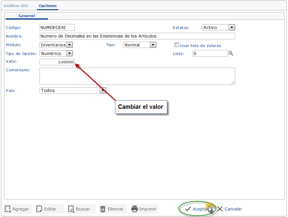 ; donde nos permitirá Buscar el campo para cambiar la cantidad de decimales en existencias.