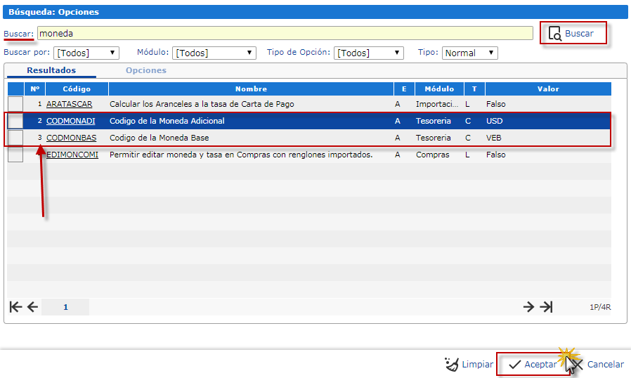 Donde seleccionamos la moneda adicional o la moneda base, oprimiendo la casilla que se encuentra a la izquierda del nombre de la moneda CODMONADI o CODMONBAS.