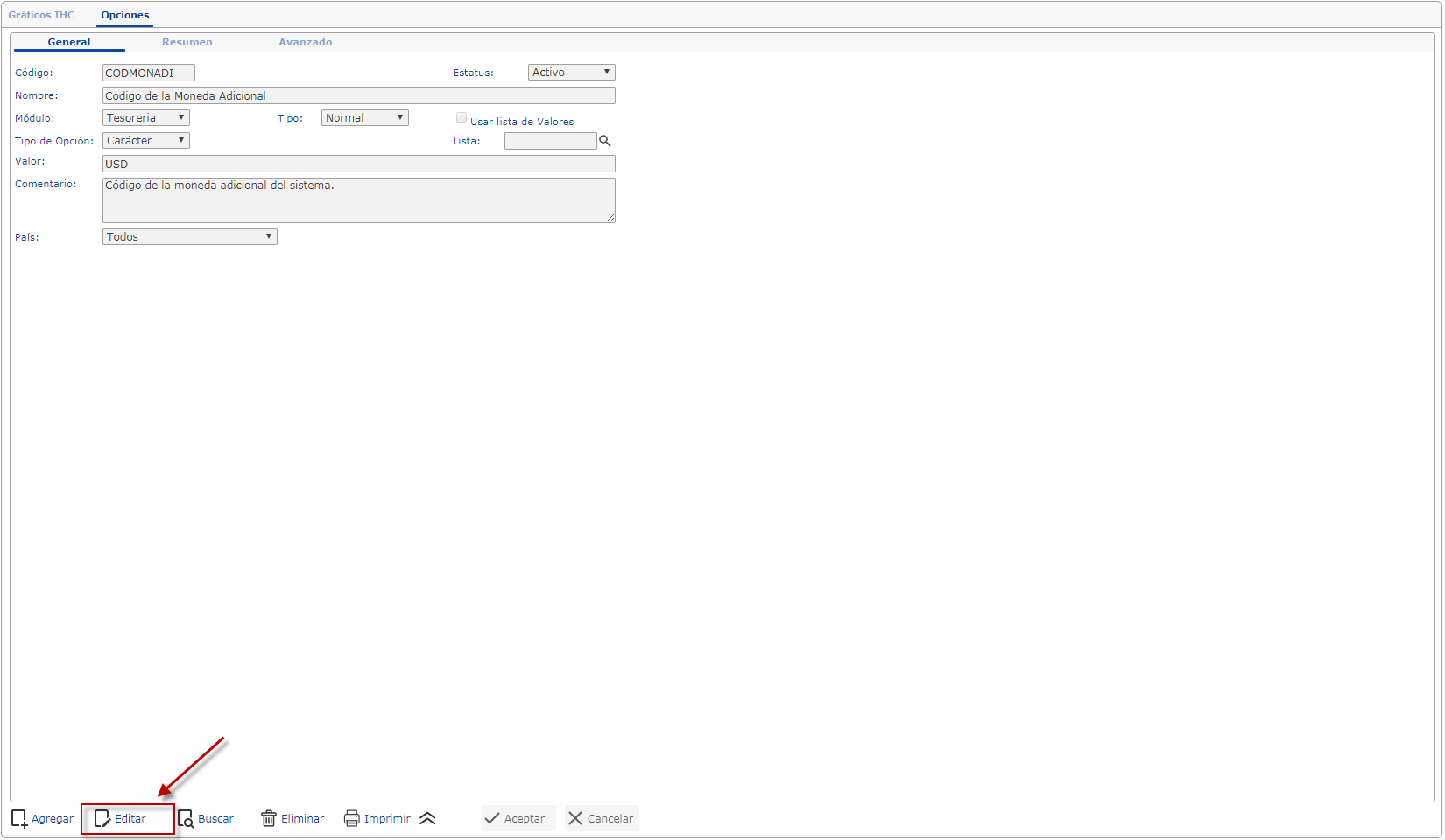 a. Para editar la moneda seleccionada, luego de oprimir la moneda se muestra el formulario de la moneda a cambiar y presionaremos el botón
