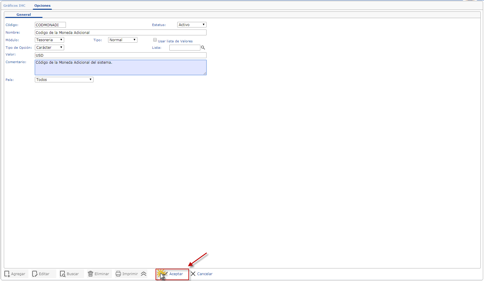 Al terminar de cambiar algunos cambios de la moneda tenemos que guardar los cambios y para eso tenemos que presionar el botón