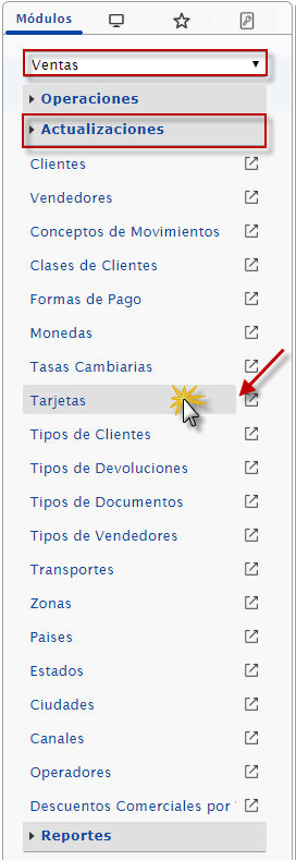 b. Después seleccionaremos el módulo Ventas, desplegamos el componente Actualizaciones y activamos el sub componente Tarjetas.