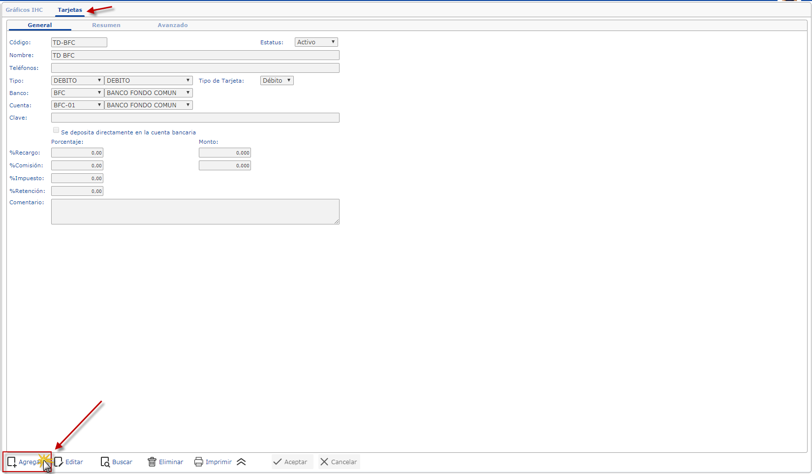b. Luego se muestra la ficha de Tarjetas donde cargaremos las tarjetas,