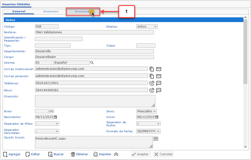 a. Luego de haber seleccionado la opción de Usuarios Globales se muestra la pantalla donde debemos hacer clic en la pestaña Avanzado.