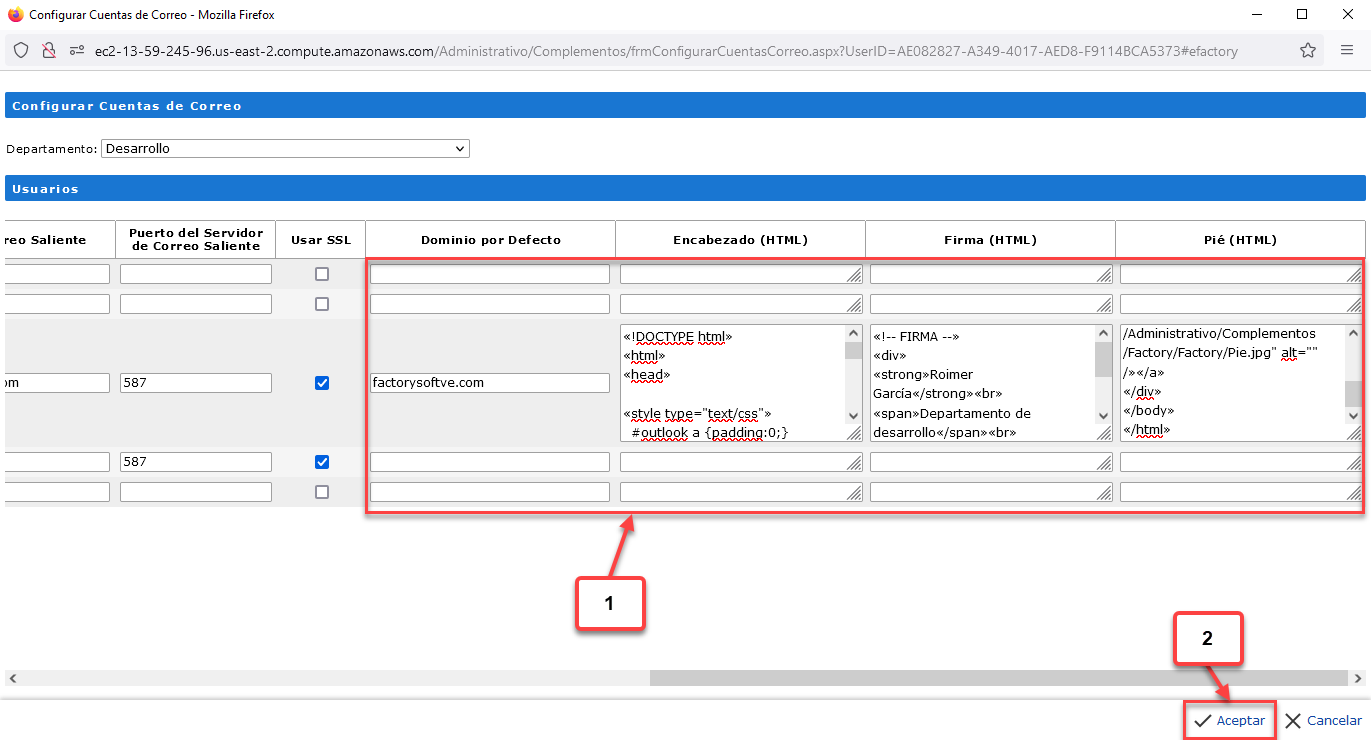 Opcionalmente podemos configurar información adicional para el correo de cada usuario, esta sería:
