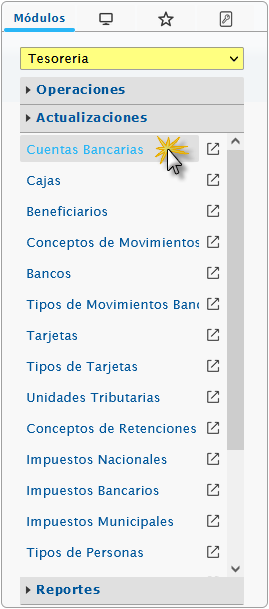 a. Al ingresar en el sistema debemos seleccionar el módulo Tesorería y al desplegar la sección de Actualizaciones seleccionaremos la opción de Cuentas Bancarias.