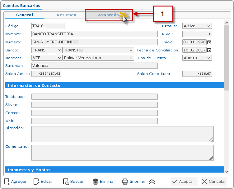 a. Luego de haber seleccionado la opción de Cuentas Bancarias se muestra la pantalla donde haremos clic en la pestaña Avanzado.