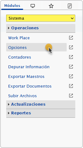 a. Al ingresar en el sistema debemos seleccionar el módulo Sistema y al desplegar la sección de Operaciones seleccionaremos la opción de Opciones.