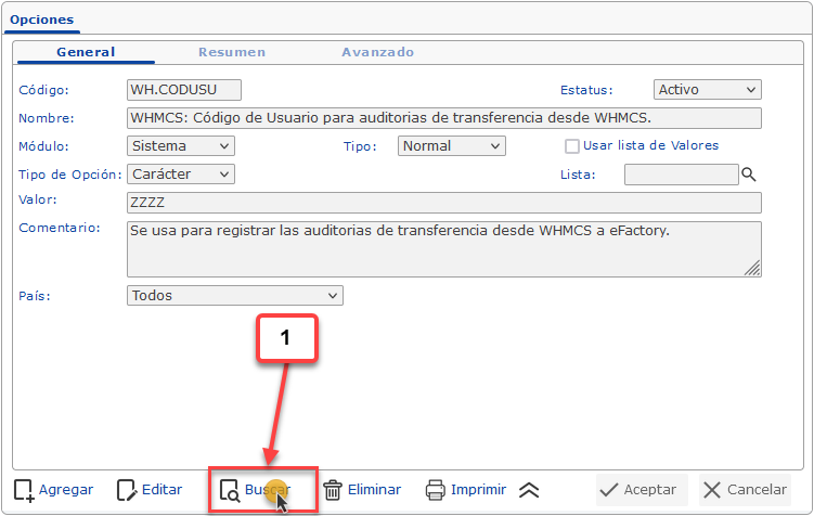 se abrirá la pantalla de Búsqueda: Opciones, en esta primero debemos buscar y seleccionar la opción