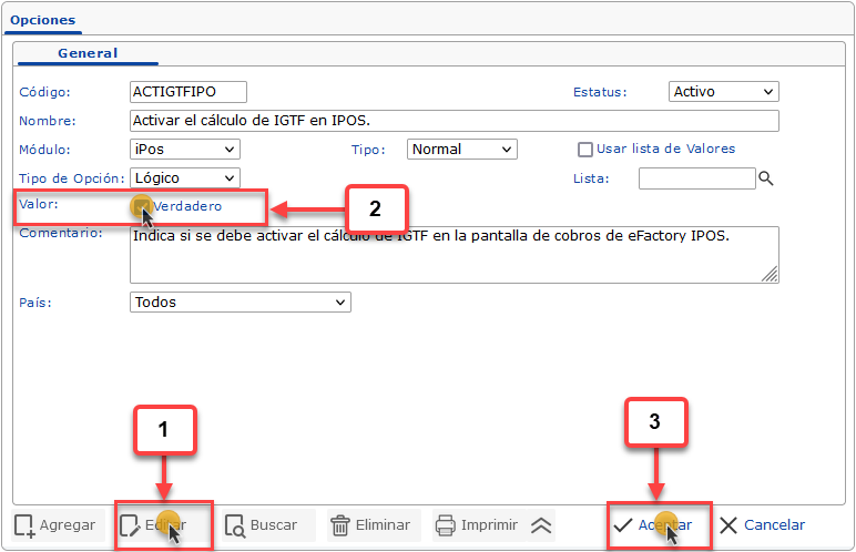 b. Luego debemos cambiar el valor de la opción a Verdadero.