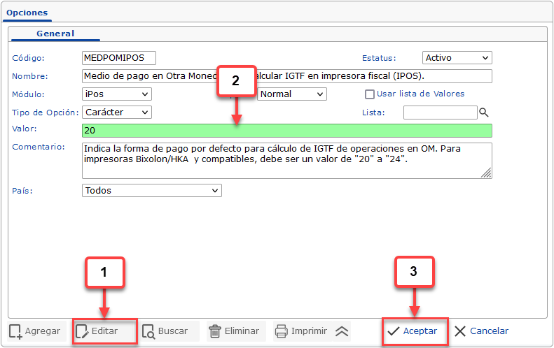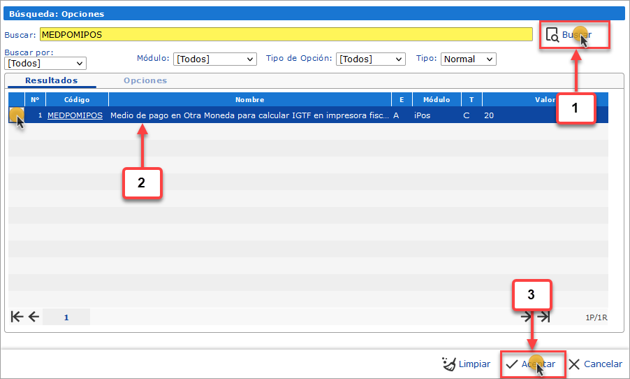 d. Despues de activar la opción ACTIGTFIPO debemos buscar y seleccionar la opción MEDPOMIPOS - Medio de pago en Otra Moneda para calcular IGTF en impresora fiscal (IPOS)