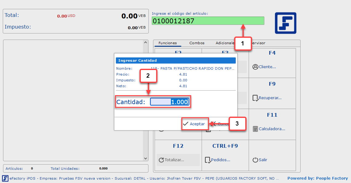 b. Una vez hayamos seleccionado al cliente, debemos indicar los artículos que se facturarán, ingresando el código del artículo, indicando la cantidad y presionando