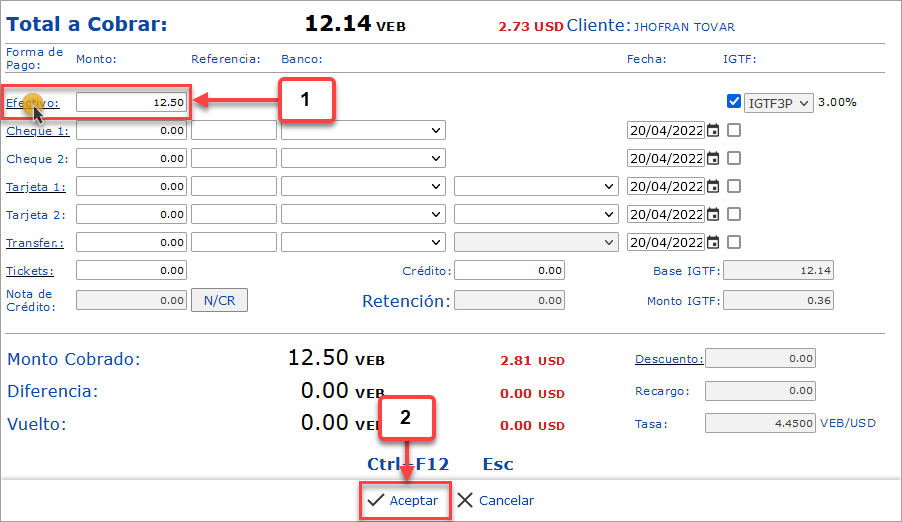 c. Por último, despues de indicar las formas de pago del cliente, con su IGTF, debemos hacer clic en el botón