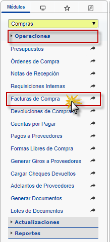 b. En el módulo Compras, desplegamos el componente Operaciones, activamos el sub componente Facturas de Compra.