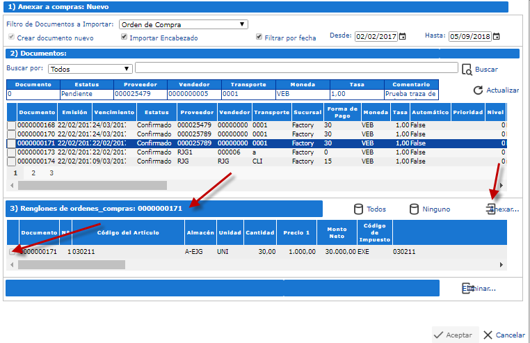 b. Al anexar Renglones, estos pasan ahora de la sección 3 a la sección 4, mostrando solo las cantidades pendientes por consumir en la Factura de Compra.