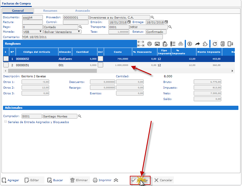 Al terminar de anexar los Renglones, veremos el nuevo Documento de Factura de Compra, procedemos a verificar y generar el registro, para lo cual ingresamos los campos Factura y Control; también podemos ajustar el Costo de los renglones, Comentario y demás datos que se requiera modificar.