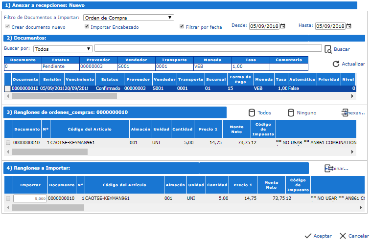 b. Al anexar Renglones, estos pasan ahora de la sección 3 a la sección 4, mostrando solo las cantidades pendientes por consumir en la Nota de Recepción.