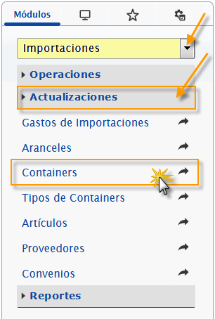 b. En el módulo Importaciones, desplegamos el componente Actualizaciones y activamos el sub componente Containers.
