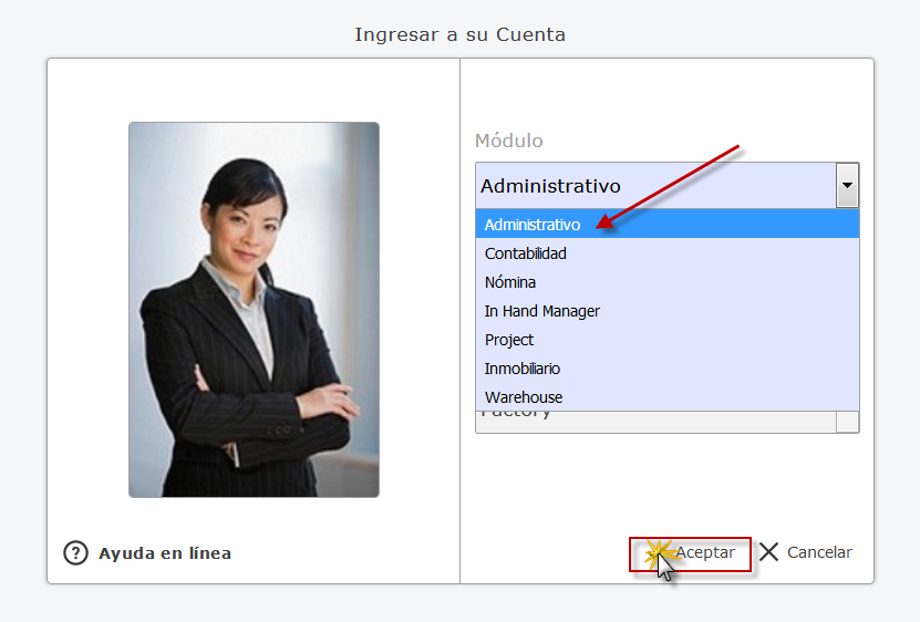 Administrativo, empresa y sucursal de la emprasa y presionamos el botón