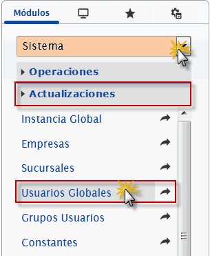 b. En el módulo Sistemas, desplegamos el componente Actualizaciones y activamos el sub componente Usuarios Globales.