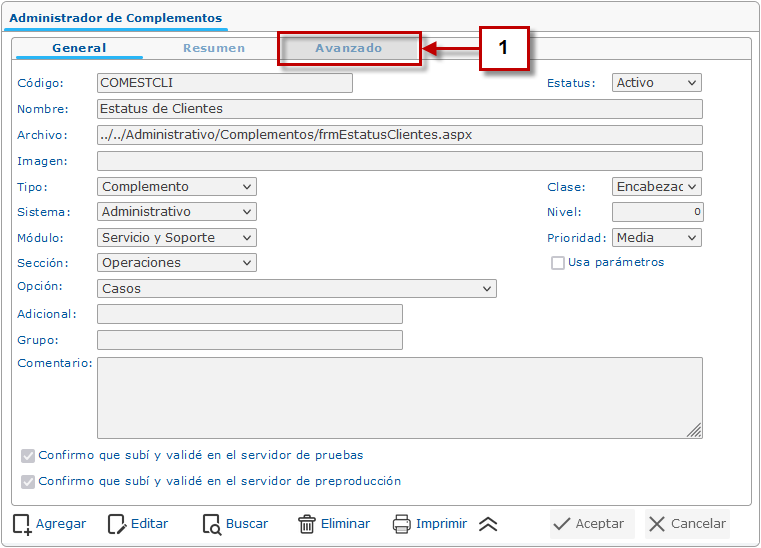 a. Luego de seleccionar el complemento, debemos hacer clic en la pestaña Avanzado.