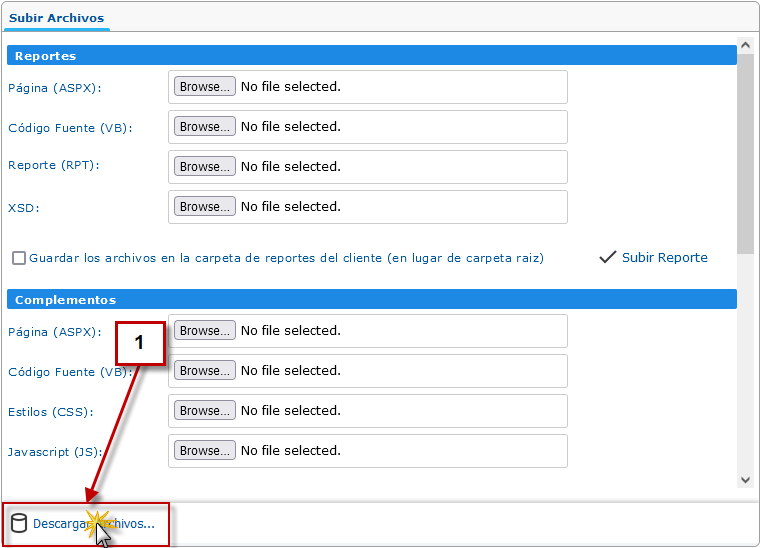 b. Luego de haber seleccionado la opción de Subir Archivos se muestra la pantalla donde debemos subir los archivos (aspx, vb) en la sección Complementos y