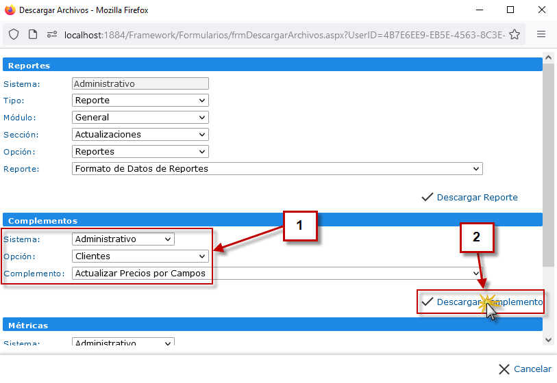 se abrirá el formulario Descargar Archivos, en este debemos seleccionar el complemento que deseamos descargar,