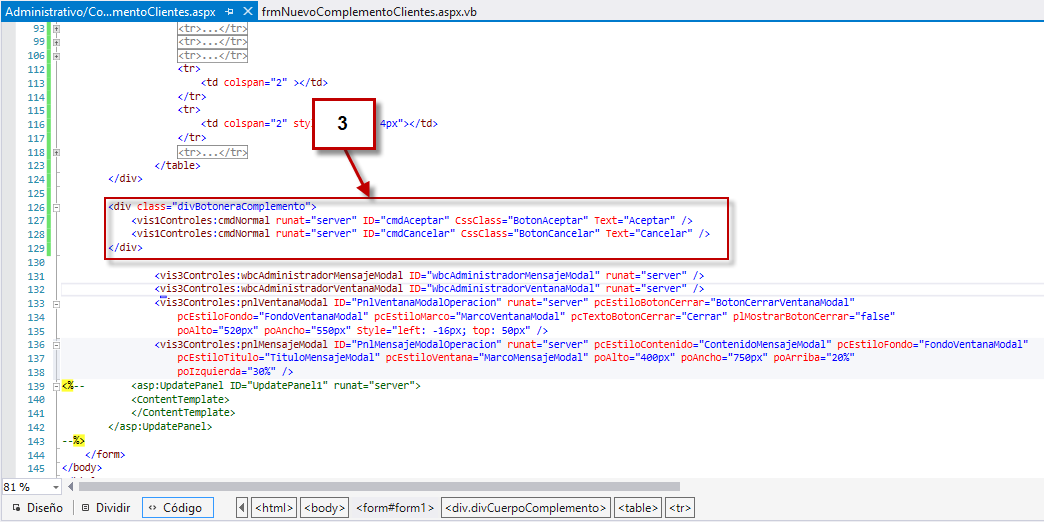 1. En el archivo .aspx: Este es el archivo en el que se programa la apariencia visual del complemento, en este archivo debemos editar: