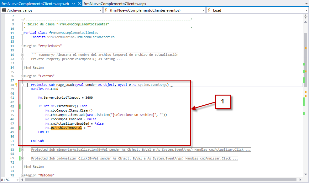 2. En el archivo .aspx.vb: Este es el archivo que ejecuta las funciones del complemento del lado del servidor y se encarga de hacer las consultas a Base de Datos. Este archivo cuenta con secciones o regiones que nos permiten mantener el código ordenado, estas regiones son: